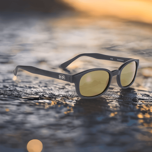 KD's 2000 zonnebril met matzwart montuur en goudkleurige glazen met spiegeleffect